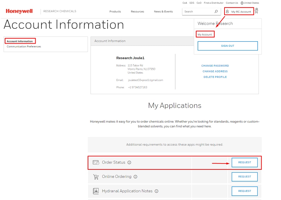 Request access to applications such as order status, application notes, online ordering and distributor resources* under the Account Information tab on your account dashboard (“My RC Account”).