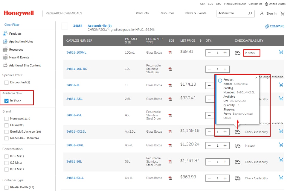 Plan with confidence by verifying that a product is available for immediate dispatch. You will be able to quickly see which products are in stock or have limited quantities remaining in your search results or when you navigate to a product detail page (must make a selection for packaging size and container type).